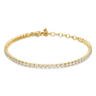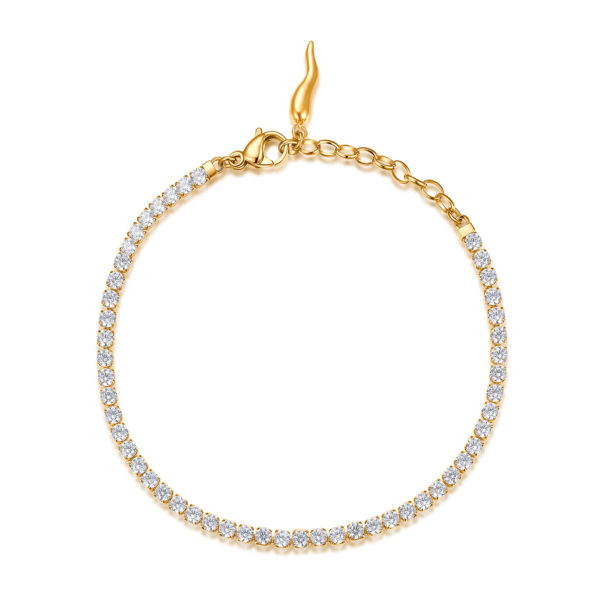 Bracciale tennis in acciaio 304 e pvd oro con cubic zirconia bianchi e pendente chiusura con cornetto portafortuna.