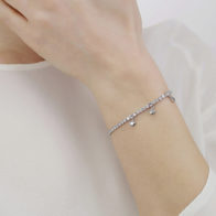 Bracciale tennis in acciaio 304 con cubic zirconia bianchi, pendenti a forma di cuore e chiusura con pendente a forma di cuore con smalto rosso.