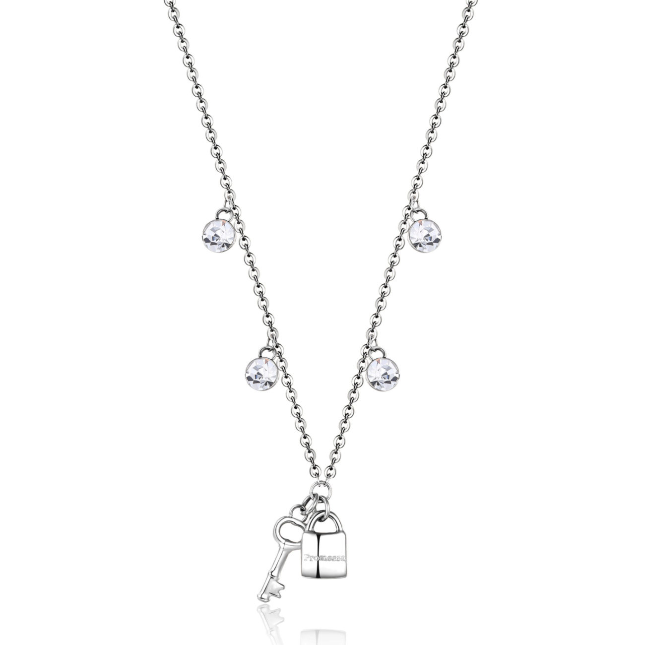 Collana in acciaio 316L con pendenti a forma di lucchetto e chiave con cristalli.