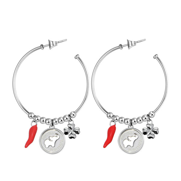 Orecchini a cerchio grandi in acciaio 316L con pendente con elefante e a forma di quadrifoglio e cornetto con smalto rosso.