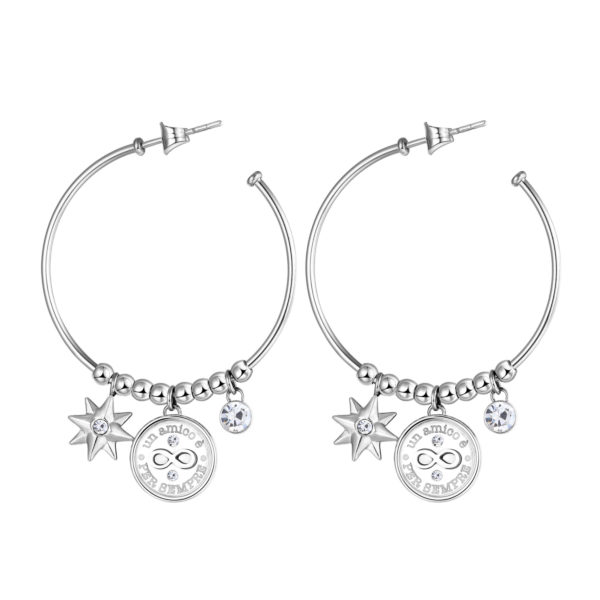 Orecchini a cerchio grandi in acciaio 316L con pendente con infinito e a forma di stella polare con cristalli.